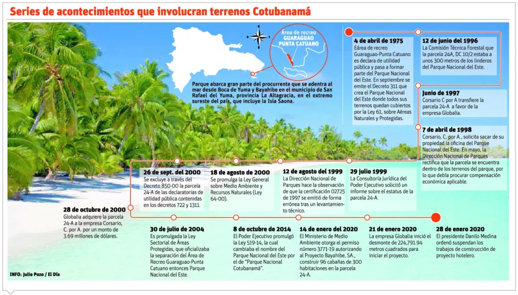 A pesar de que dichos terrenos fueron declarados de utilidad pública mediante decreto en 1975, en 1994 fueron divididos en la parcela 24-A y 24-B por la familia Hubiera, propietarios en ese entonces, quienes cedieron la primera parte a la empresa Corsario C por A, explicó el exdirector Nacional de Parques, Omar Ramírez.