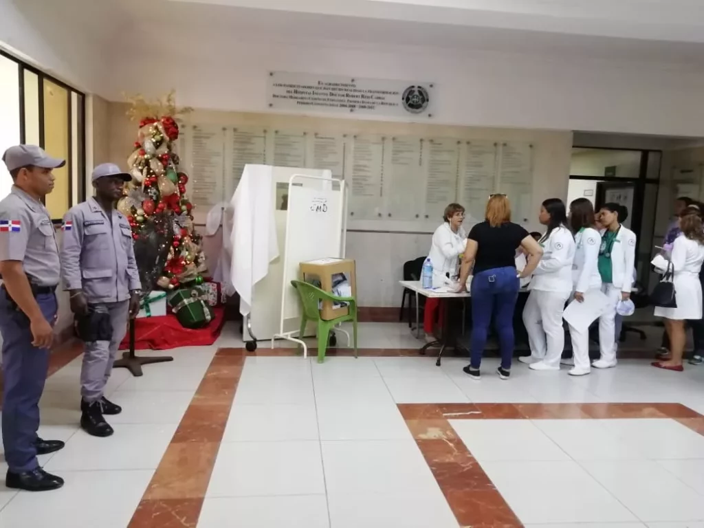 Contrario a la sede del CMD, la mesa de votación ubicada en el Hospital Infantil Robert Reid Cabral es custodiada por efectivos de la Policía Nacional.