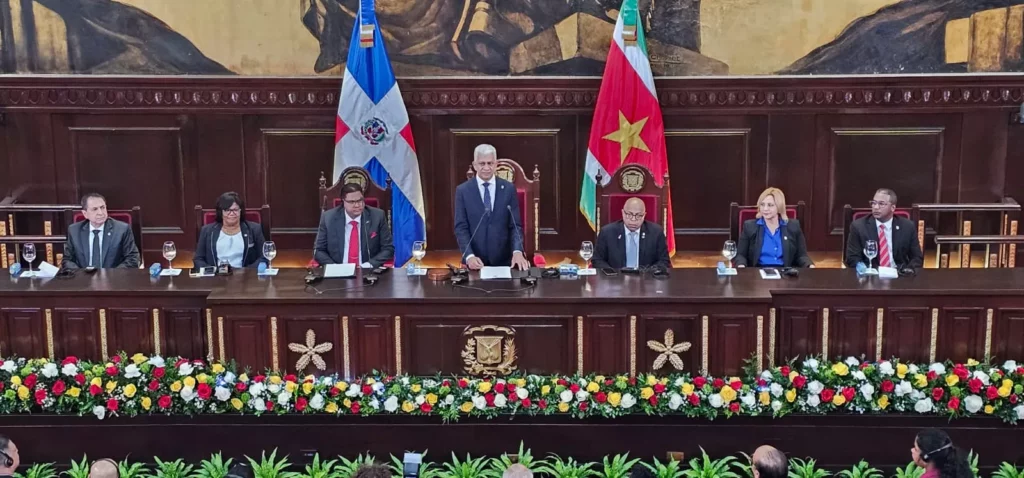 SANTO DOMINGO. – El Congreso Nacional se constituyó en Reunión Conjunta para recibir este jueves al presidente de la República de Surinam, Chandrikapersad Santokhi, en una ceremonia solemne que se realizó en el Salón de la Asamblea Nacional, como parte de la visita oficial del mandatario al país.