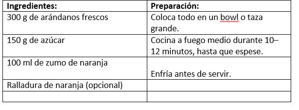 Salsa de arándanos casera: arándanos cocidos con azúcar y zumo de naranja, ideal para acompañar el pavo.