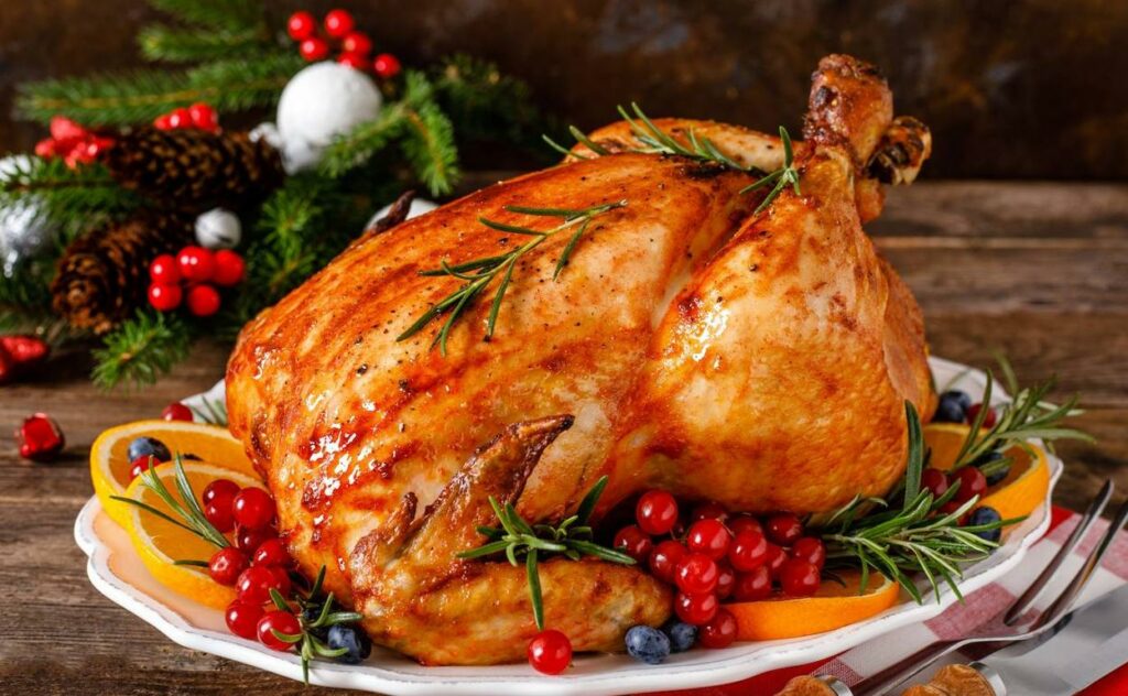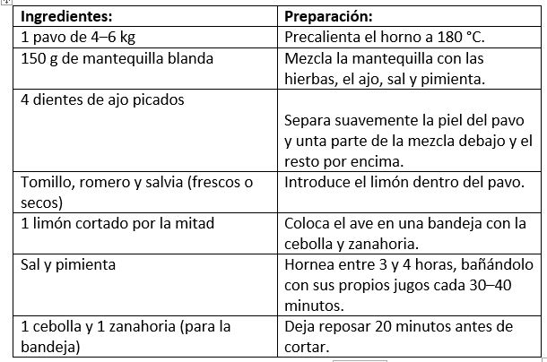 Pavo asado clásico: marinado con mantequilla, hierbas aromáticas, ajo y limón, y horneado lentamente hasta alcanzar una textura jugosa.