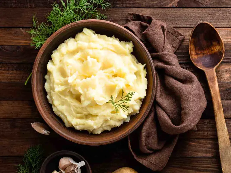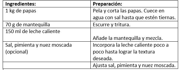 Puré de papas cremoso: elaborado con papas cocidas, mantequilla y leche caliente, con la posibilidad de añadir nuez moscada.