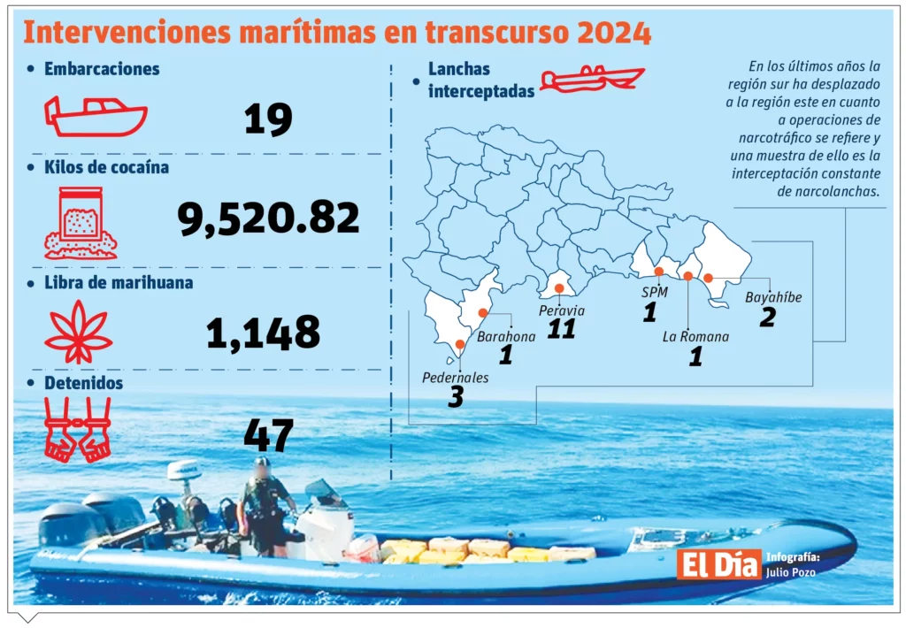 Los meses de marzo y julio son los que registran mayores interceptaciones de lanchas que han intentado introducir alijos a territorio dominicano con cuatro por cada mes, respectivamente.