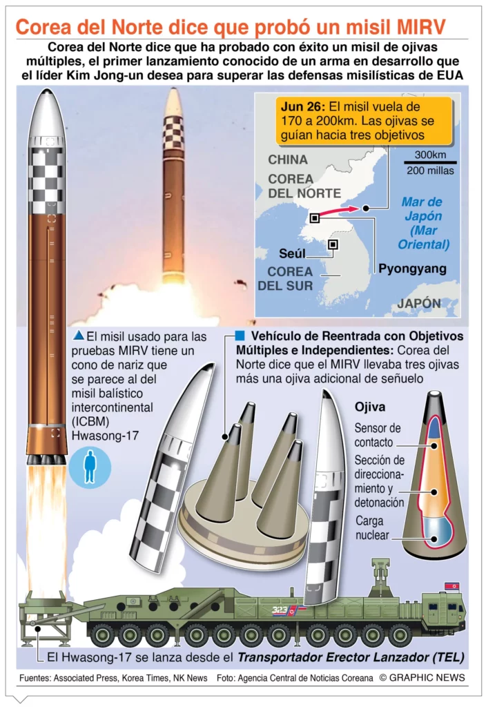 La agencia estatal de noticias KCNA afirmó que la Dirección General de Misiles del Norte “realizó con éxito una prueba de control de separación y orientación de ojivas móviles individuales".