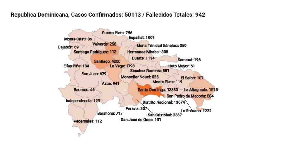 SANTO DOMINGO.-El Ministerio de Salud Pública informó este viernes que el número de casos de coronavirus en el país asciende ya a 50,113 mientras que los fallecidos suman 942 (uno más que ayer), mientras que el total de los recuperados es 24,423.