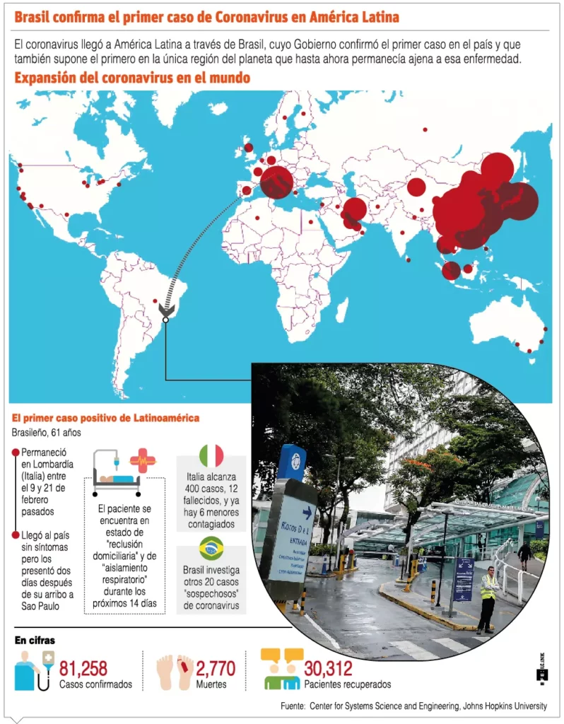 Con la confirmación ayer del primer caso de la enfermedad en Brasil, el mundo está más alerta que nunca, tomando nuevas medidas para protegerse de un mal que ha dejado más de 2,600 muertos y 80,000 infectados en más de 40 países, la mayoría en China, donde se originó.