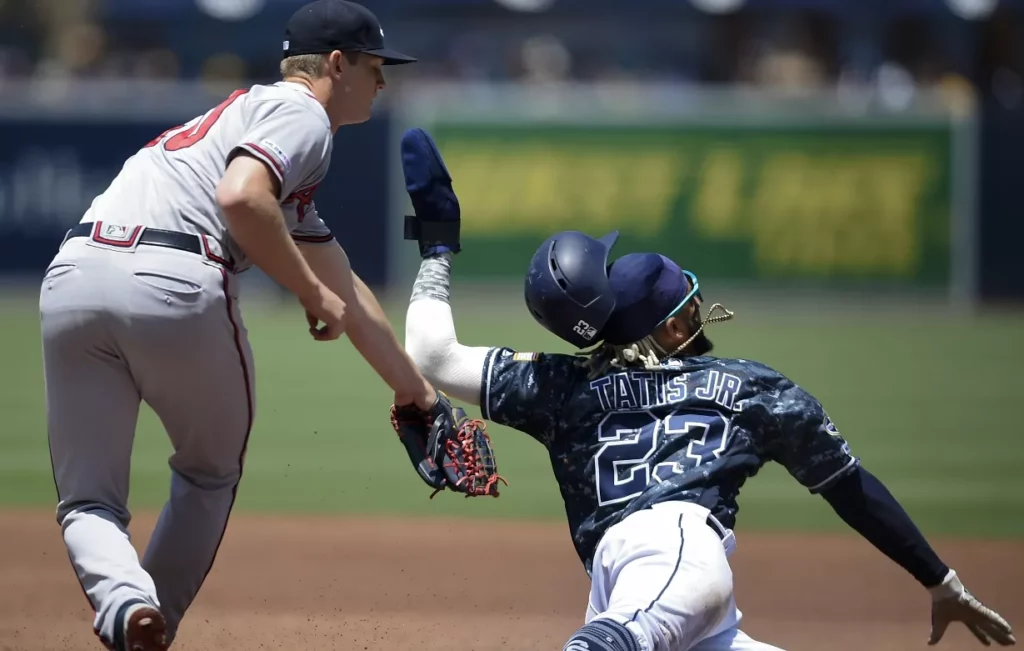 El torpedero de los Bravos, Dansby Swanson, persiguió a Tatis hacia la inicial antes de tirarle la bola a Soroka, mucho antes de que Tatis llegara a la base. Sin embargo, Tatis dobló hacia su izquierda mientras estiraba su pierna derecha para alcanzar la primera almohadilla. Inexplicablemente, el quisqueyano evitó el toque de Soroka.