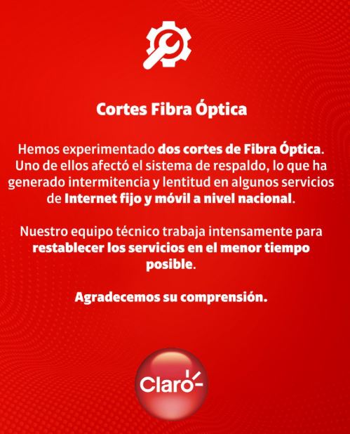 Santo Domingo.- La compañía de telecomunicaciones Claro informó este martes que dos cortes de fibra óptica afectan sus servicios de internet fijo y móvil a nivel nacional.