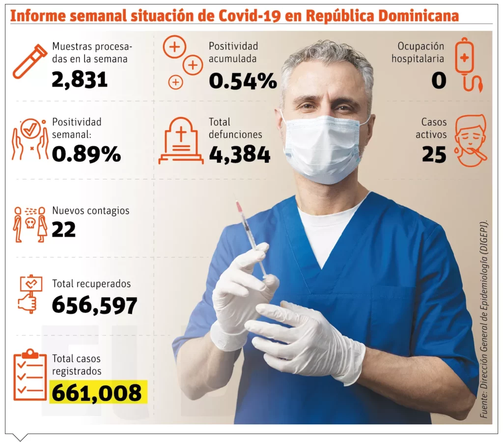 El informe semanal de la Dirección General de Epidemiología (Digepi), reportó el miércoles 22 nuevos casos, que resultaron del procesamiento de 2,831 pruebas, para una positividad semanal de 0.89 % y acumulada de 0.54 %.