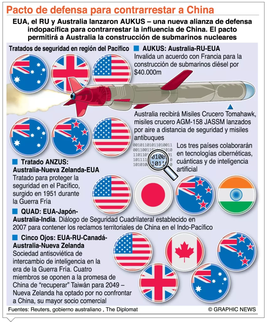 Las autoridades chinas, que han construido bases militares en el Indopacífico, han criticado el acuerdo de Australia, Estados Unidos y Reino Unido, conocido como AUKUS, al considerar que promueve la proliferación nuclear y que responde a una mentalidad de la guerra fría.