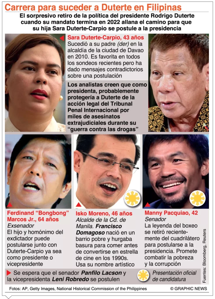 “Uníos a mí en la más noble de las causas y tendremos éxito”, dijo “Bongbong” Marcos delante de un grupo de simpatizantes al final del vídeo, grabado en Manila. La candidatura llega después de meses de rumores difundidos en la prensa y las redes sociales, donde se especuló con que elegirá como compañera para la vicepresidencia a Sara Duterte, hija del actual presidente, que también se plantea optar a la presidencia.