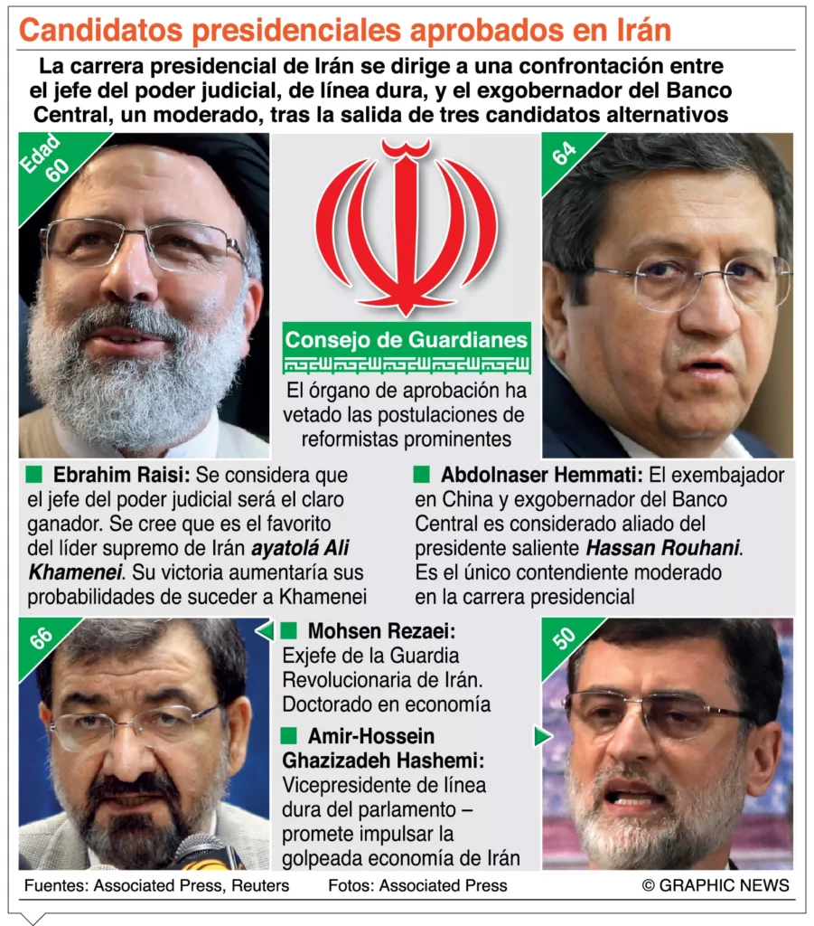 Las candidaturas aprobadas por el Consejo de Guardianes fueron siete, pero en los días previos a la cita con las urnas, convocada para hoy, tres de ellos se retiraron de la carrera a la Presidencia para favorecer a otros aspirantes con más peso y de similar ideología.