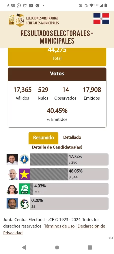 En Jarabacoa, Joselito Abreu, del PLD lleva la delantera con 48.05%, frente a 47.72% de Yunior Torres, por el PRM.
