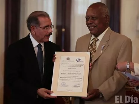 SANTO DOMINGO.- El presidente Danilo Medina entregó el Premio Nacional de Periodismo 2013 al periodista Emilio Herasme Peña, seleccionado a unanimidad por el jurado del galardón, en reconocimiento a sus 50 años en el ejercicio de la comunicación social, sus aportes a las labores gremiales y profesionales, así como su honestidad y méritos patrióticos.