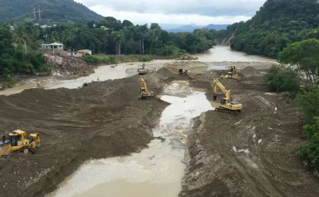 El Ministerio de Obras Públicas construye muros de gaviones para canalizar el río Bajabonico en Imbert, Puerto Plata, para evitar que nuevamente las aguas desbordadas afecten los aproches del puente e incomuniquen a Navarrete con el municipio cabecera.