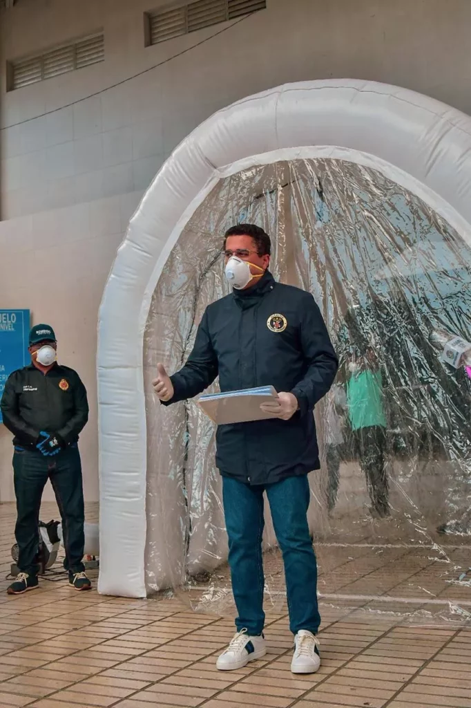 Collado anunció que este es el primero de 10 túneles que se instalarán en diferentes mercados y puntos de gran afluencia de personas en la capital como medida para contrarrestar la propagación del COVID 19 en la ciudad.
