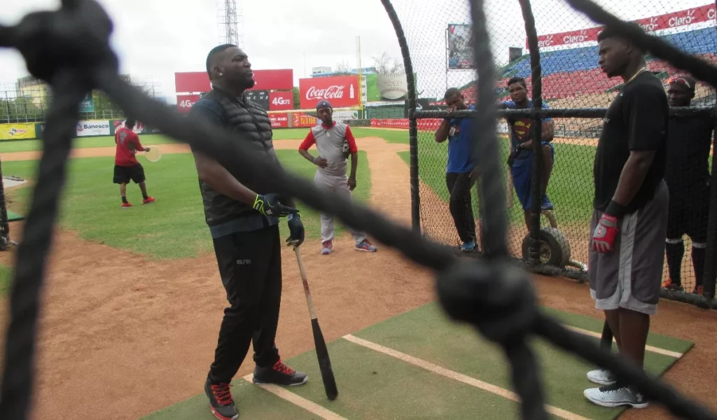 En medio de su rutina de practica de bateo, David sacó tiempo para enseñarles algunos trucos de bateo a los jóvenes Gregory Polanco y Julio Borbón.