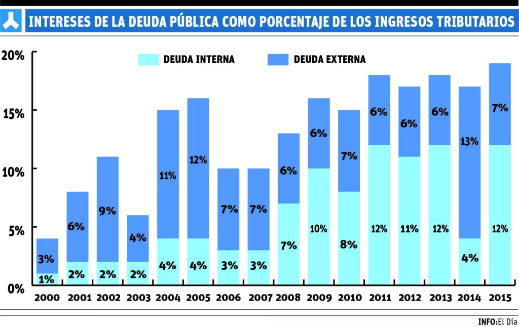 “La capacidad de pago del país descansa en realidad en la posibilidad de recaudar tributos por el Estado, y para 2015 esa proporción alcanza el máximo histórico de 19.4%”, explicó el economista, al analizar los pagos de intereses de la deuda pública como porcentaje de los ingresos tributarios, desde el año 2000 a 2015.