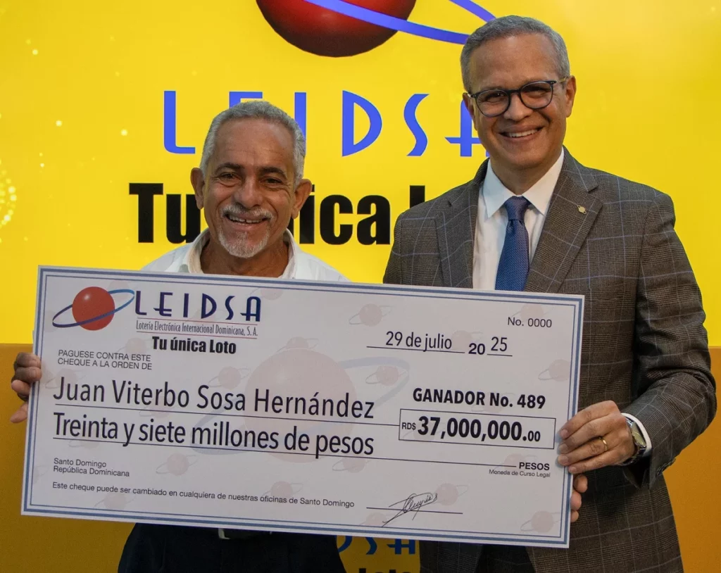 La Lotería Electrónica Internacional Dominicana, S,A (Leidsa), informó que Juan Viterbo Sosa Hernández recibió el cheque de 37 millones de pesos, al resultar ganador en el sorteo del pasado sábado 5 de julio.