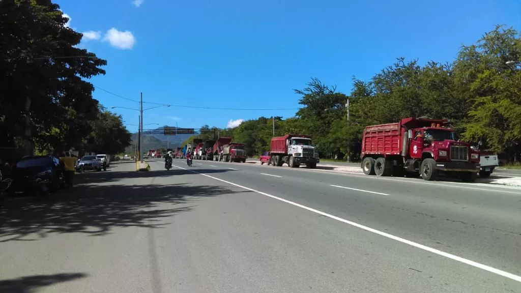 Santo Domingo.- Decenas de camioneros pertenecientes a la Federación Dominicana de Transportistas pertenecientes a San Cristóbal mantienen paralizadas sus unidades desde las primeras horas de este lunes en apoyo a sus colegas de Montecristi que hoy reclaman el 50% de participación en las operaciones que realiza la empresa Malespin en esa localidad.
