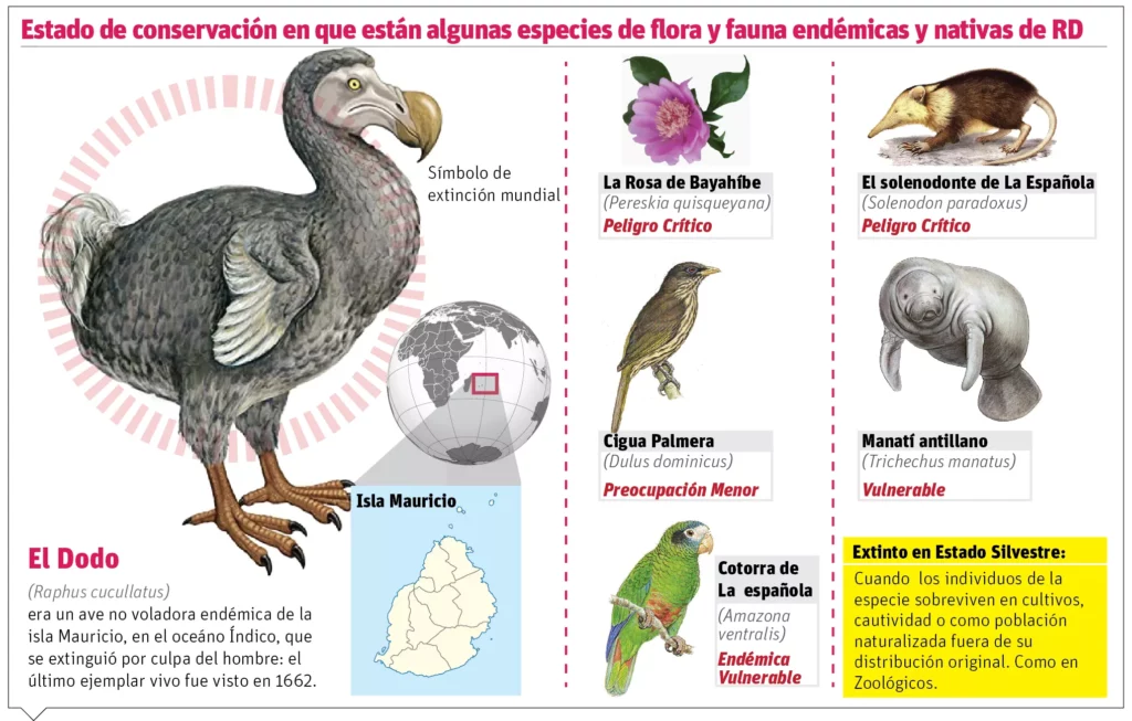Citó el caso de El dodo (Raphus cucullatus) última ave no voladora endémica de la isla Mauricio, en el Océano Índico, que se extinguió por culpa del hombre, y su último ejemplar vivo fue visto en el año 1,700 y es considerada un símbolo de Extinción.