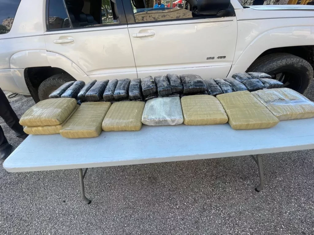 Al ser requisada la jeepeta marca 4Runner, placa BB-89135, se descubrió en el tanque de la gasolina y otros dos compartimientos, varias caletas, en cuyo interior se hallaron 38 pacas presumiblemente de marihuana, con un peso aproximado de 90 libras.