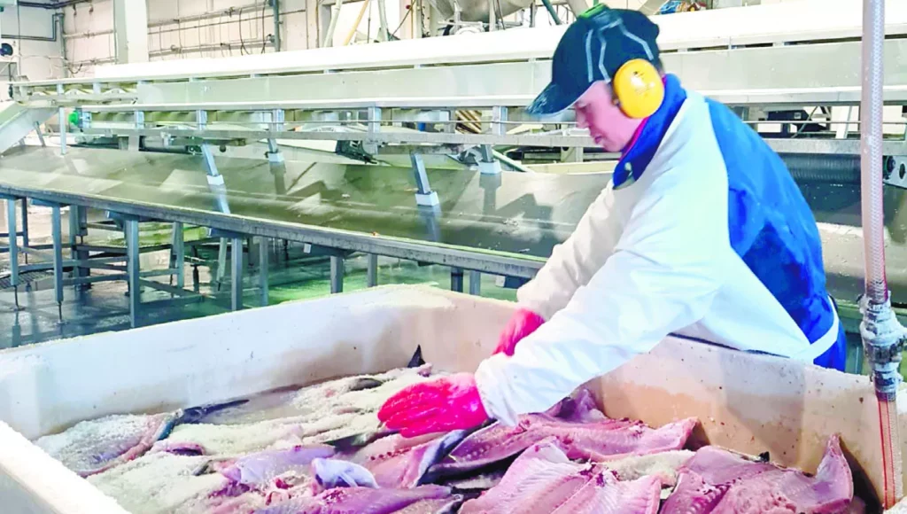 Del frigorífico sale para ser descongelado en un gran estanque de agua, donde permanece por unas 24 horas. Pasado este tiempo, el pescado pasa al área de limpieza, gran parte de este proceso está automatizado, donde se le extrae la espina para enviar al área del salado.