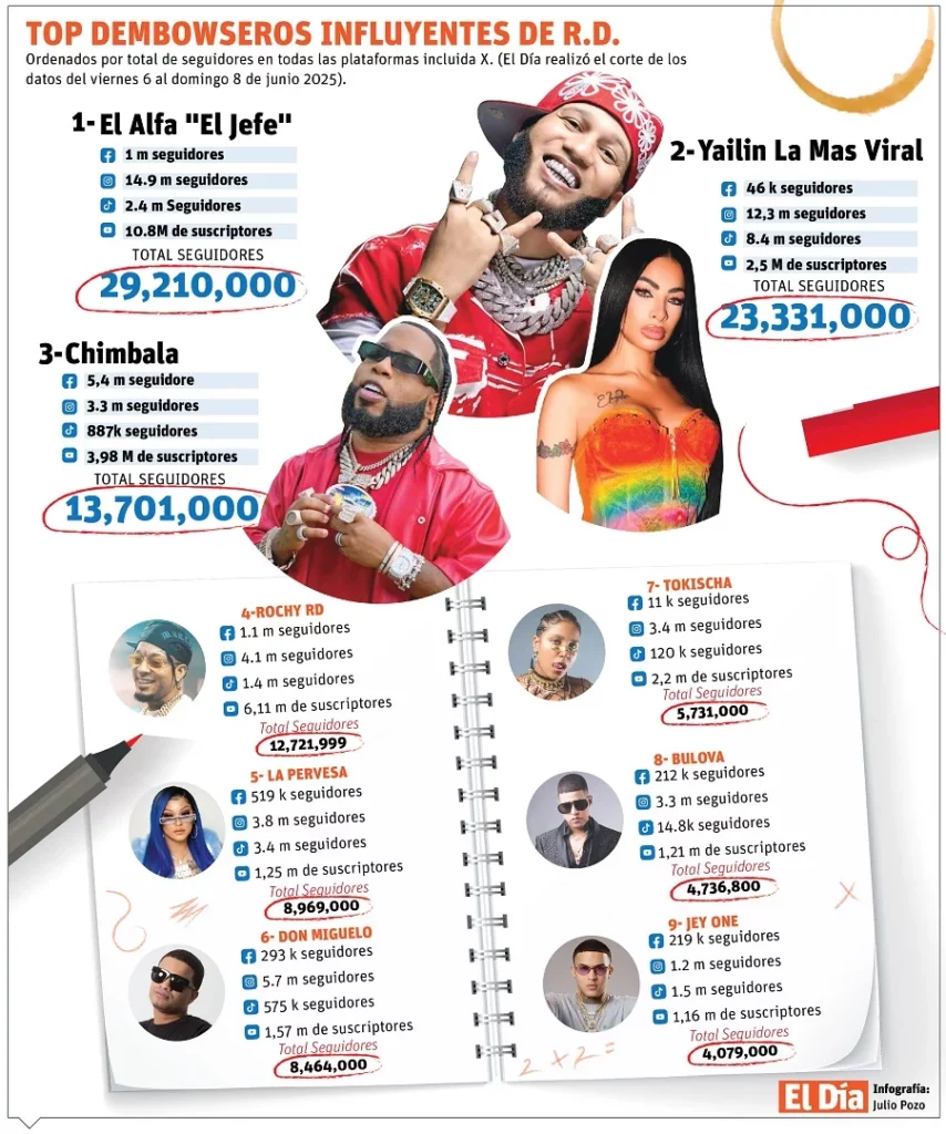 Los números lo confirman: El Alfa “El Jefe” suma más de 29 millones de seguidores combinados en sus redes. Yailín La Más Viral, con más de 23 millones, ha construido una carrera donde la estética y la narrativa personal se imponen incluso sobre la música.