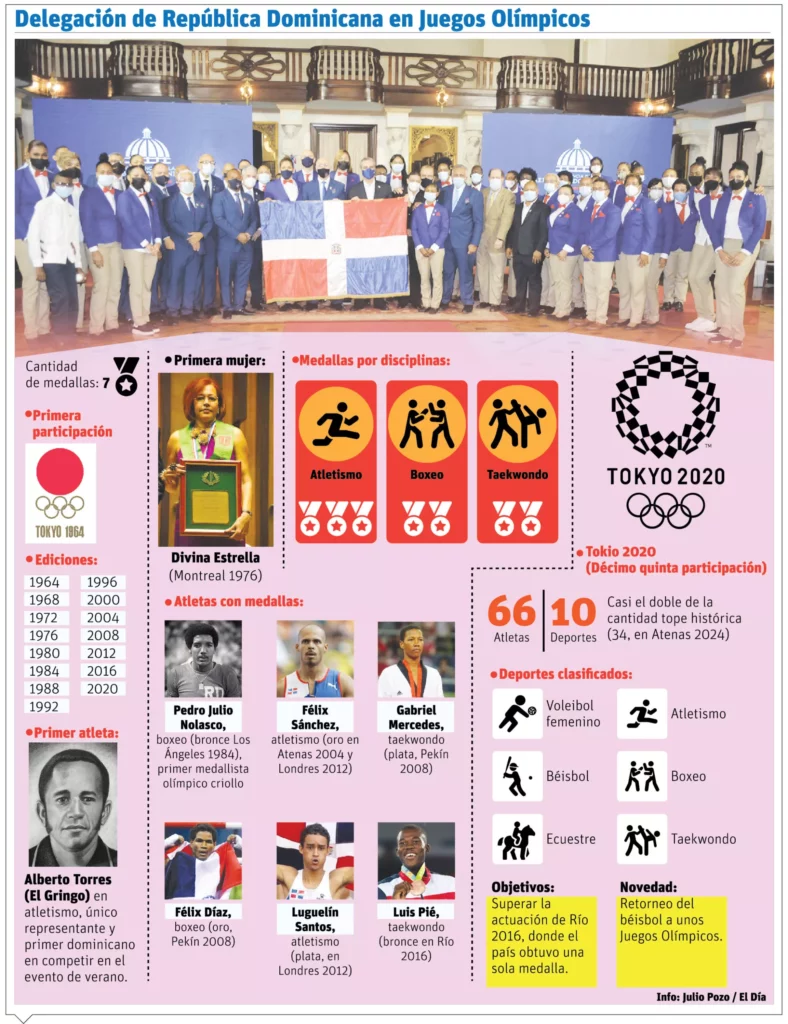 Santo Domingo.- Con una gran delegación, la mayor de su historia, integrada por 66 atletas representantes de 10 deportes, República Dominicana intentará, en los Juegos Olímpicos de Tokio, conseguir su mejor actuación en el evento veraniego, la mayor y más importante cita deportiva mundial.
