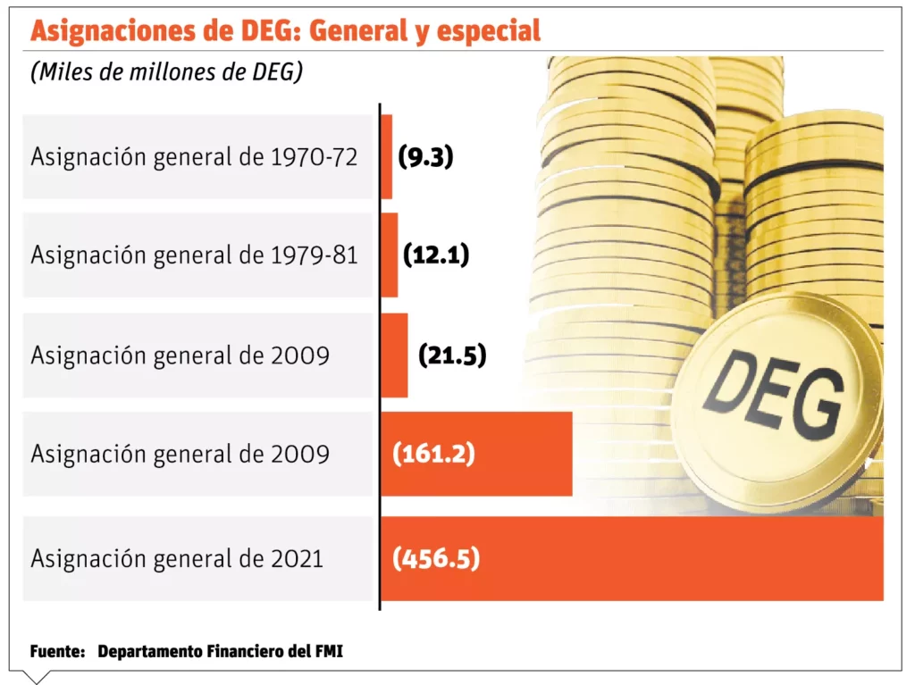 El monto de DEG depositados al país por el FMI forman parte de la entrada en vigor de la mayor asignación general de derechos Derechos Especiales de Giro que haya entregado ese organismo a sus países miembros, la cual equivale a aproximadamente US$650.000 millones.