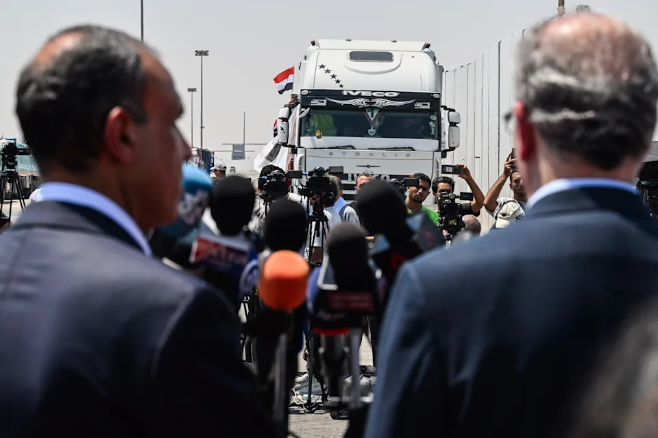 El camión de Medhat lleva azúcar, arroz, pasta y otros productos básicos, lo que él denomina "una cesta de necesidades", pero lamenta que el Ejército de Israel no permite ingresar estos alimentos en el cruce de Kerem Shalom, a unos 3,5 kilómetros al sur del de Rafah y donde los israelíes inspeccionan las cargas procedentes de Egipto.