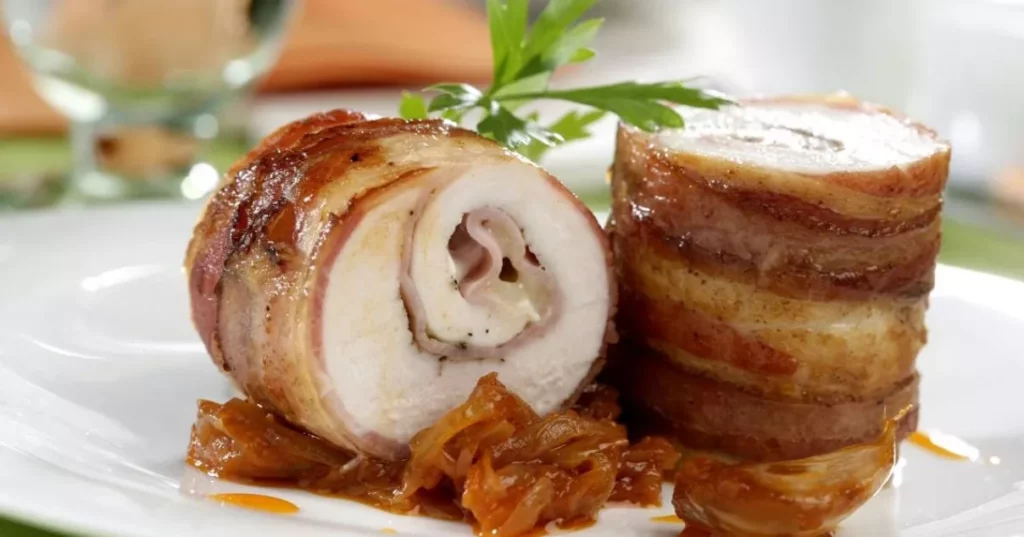 Colocar sobre cada porción de pechuga media tira de tocineta y un camarón, enrollar y agarrar con un palito.