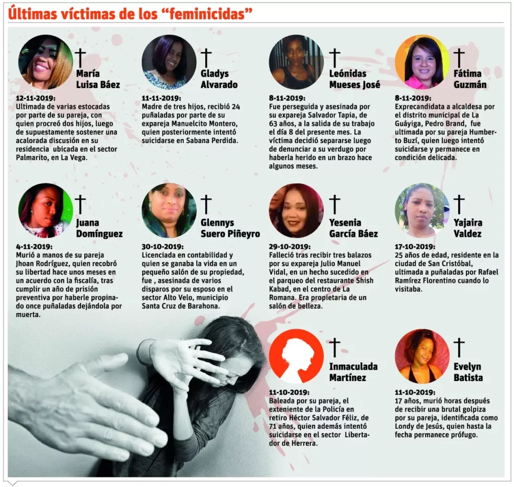 SANTO DOMINGO.-En tan solo un mes, diez mujeres fueron ultimadas por sus parejas o exparejas, teniendo como elemento común, en la mayoría de los casos, el uso de armas blanca.