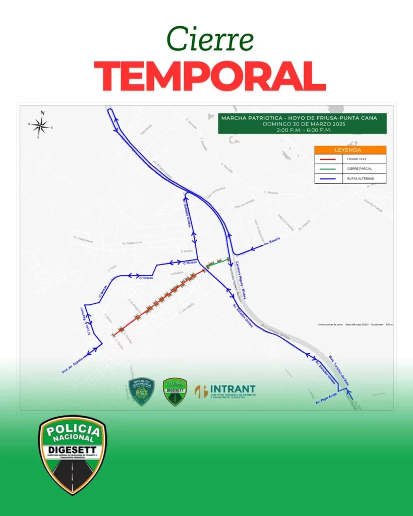 SANTO DOMINGO. La Dirección General de Seguridad de Tránsito y Transporte Terrestre (Digesett) informó sobre el cierre temporal de la Prolongación Avenida de España, en el tramo correspondiente a Hoyo de Friusa, en Punta Cana, este domingo 30 de marzo. El cierre se llevará a cabo entre las 2:00 PM y 6:00 PM, debido a la realización de la marcha en la zona.