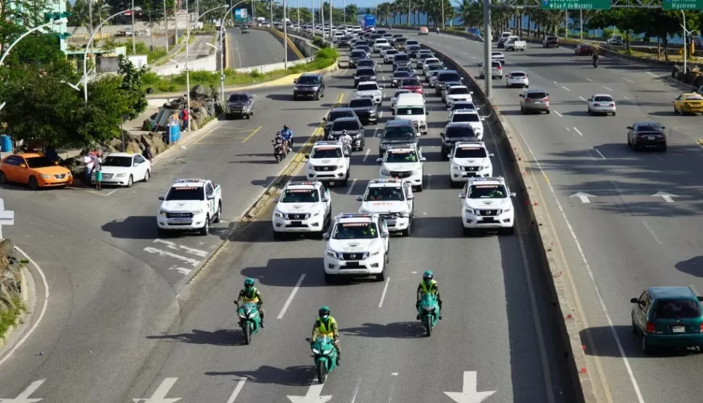 Durante el carreteo, agentes de la DIGESETT se colocan delante de los vehículos para controlar la velocidad de los conductores y evitar accidentes de tránsito, por la alta cantidad de personas que regresan a la misma hora de los distintos pueblos de República Dominicana.