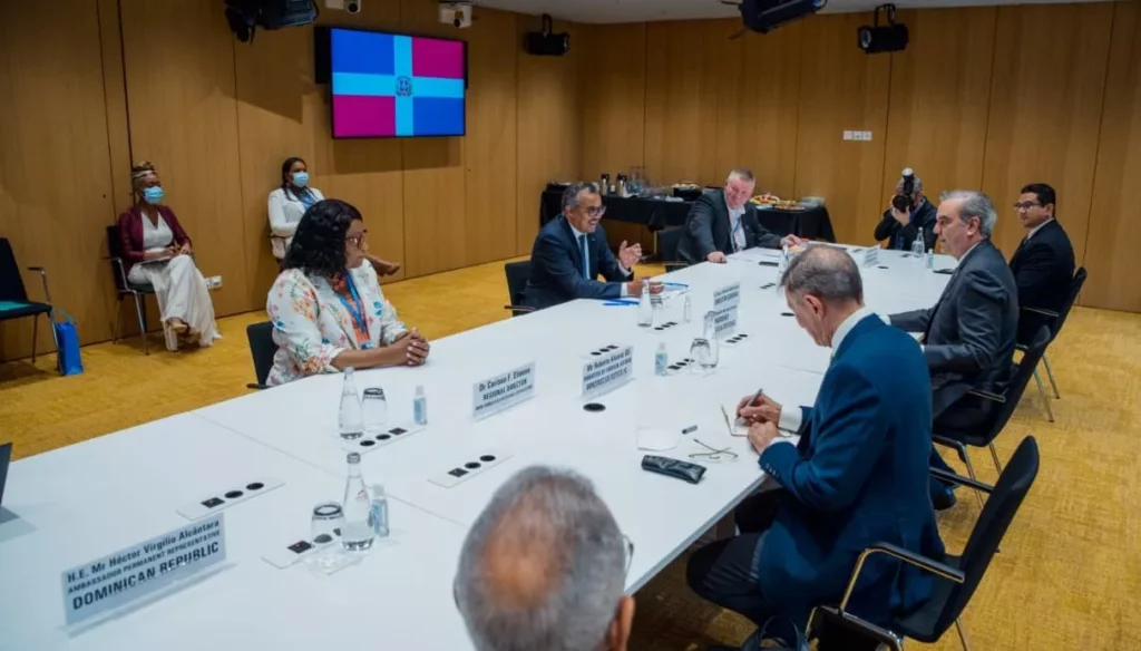 Suiza.- Al concluir la primera reunión de trabajo en Ginebra entre el presidente Luis Abinader y el director general de la Organización Mundial de la Salud (OMS), Tedros Adhanom Ghebreyesus, el mandatario se mostró satisfecho por el reconocimiento que le hacen las autoridades de salud a nivel mundial por el liderazgo de la República Dominicana frente al COVID-19.