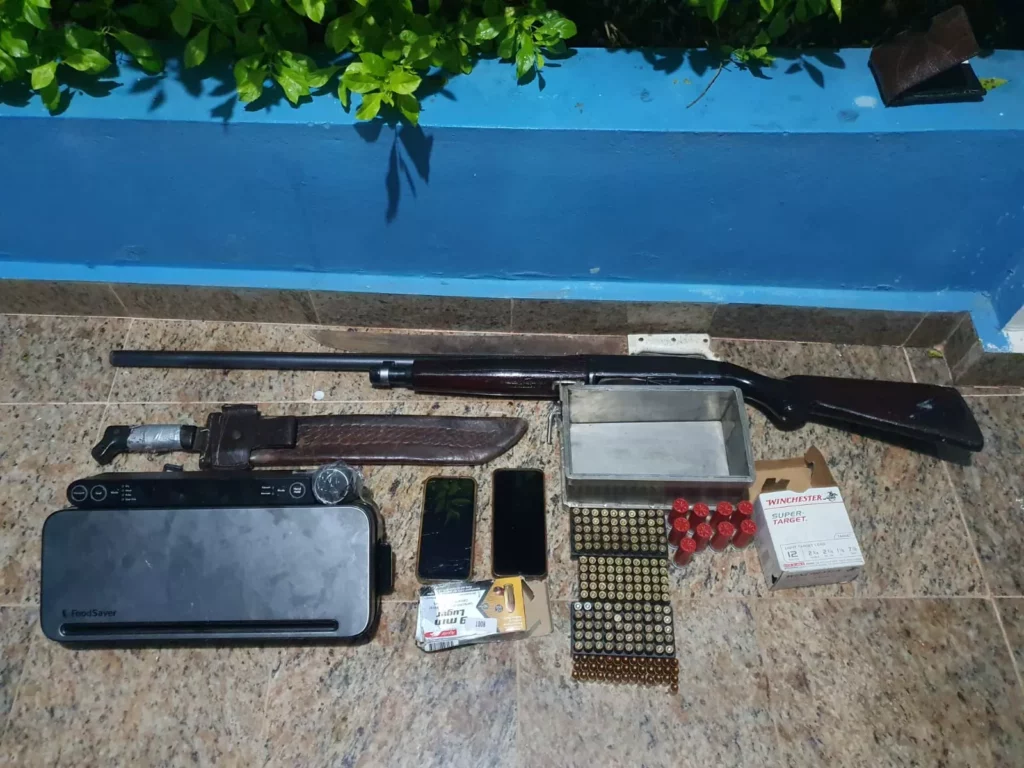El primer allanamiento fue en una finca de la Otra Banda, donde apresaron a un hombre y ocuparon una escopeta, marca winchester calibre 12 milímetros, con nueve cartuchos, sin ningún tipo de documentación, una máquina de sello al vacío, una vaqueta, un molde para compactar kilos, armas blancas y 190 cápsulas para pistolas y nueve cartuchos para escopetas calibre 12.