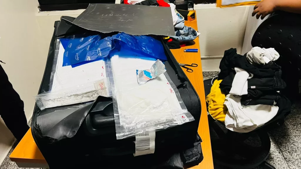 Posteriormente, las autoridaees iniciaron el proceso de revisión en presencia de un fiscal adjunto,y fue descubierto un doble fondo en una maleta, donde se ocuparon tres láminas presumiblemente cocaína, con un peso preliminar de 2. 38 kilogramos.