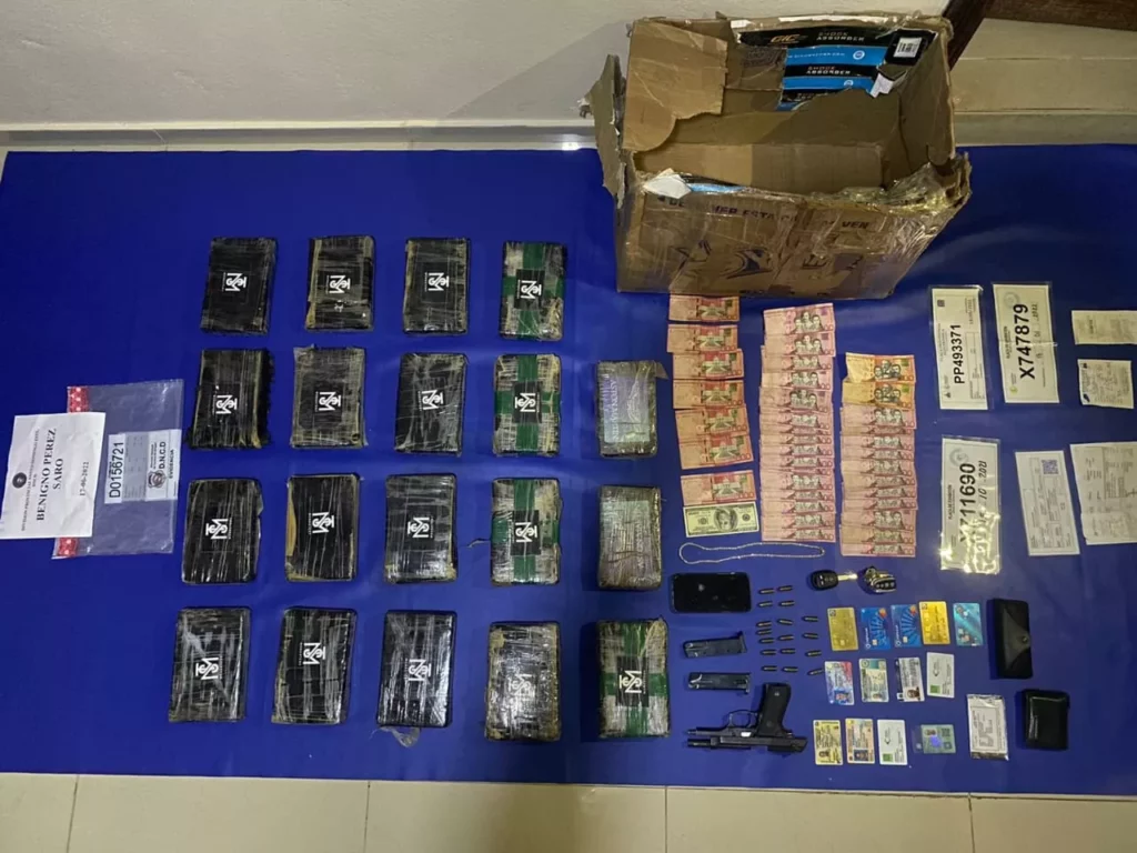 Según las autoridades, al detenido, quien será identificado oportunamente, se le ocupó además una pistola Taurus, calibre milímetros, con dos cargadores y varias cápsulas, 12,800 pesos dominicanos, 100 dólares, tres placas de exhibición, un celular, documentos personales y otras evidencias.