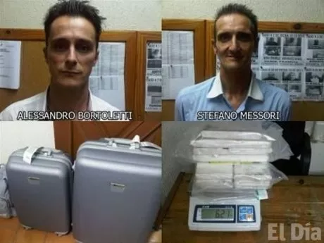 Según la nota del organismo en la maleta de Bortoletti había seis paquetes en forma de tabletas de un polvo blanco presuntamente cocaína, con peso aproximado de 3.84 kilos, mientras que la de Messori contenía cuatro paquetes, equivalentes a 2.30 kilos, para un total de 6.14 kilogramos.