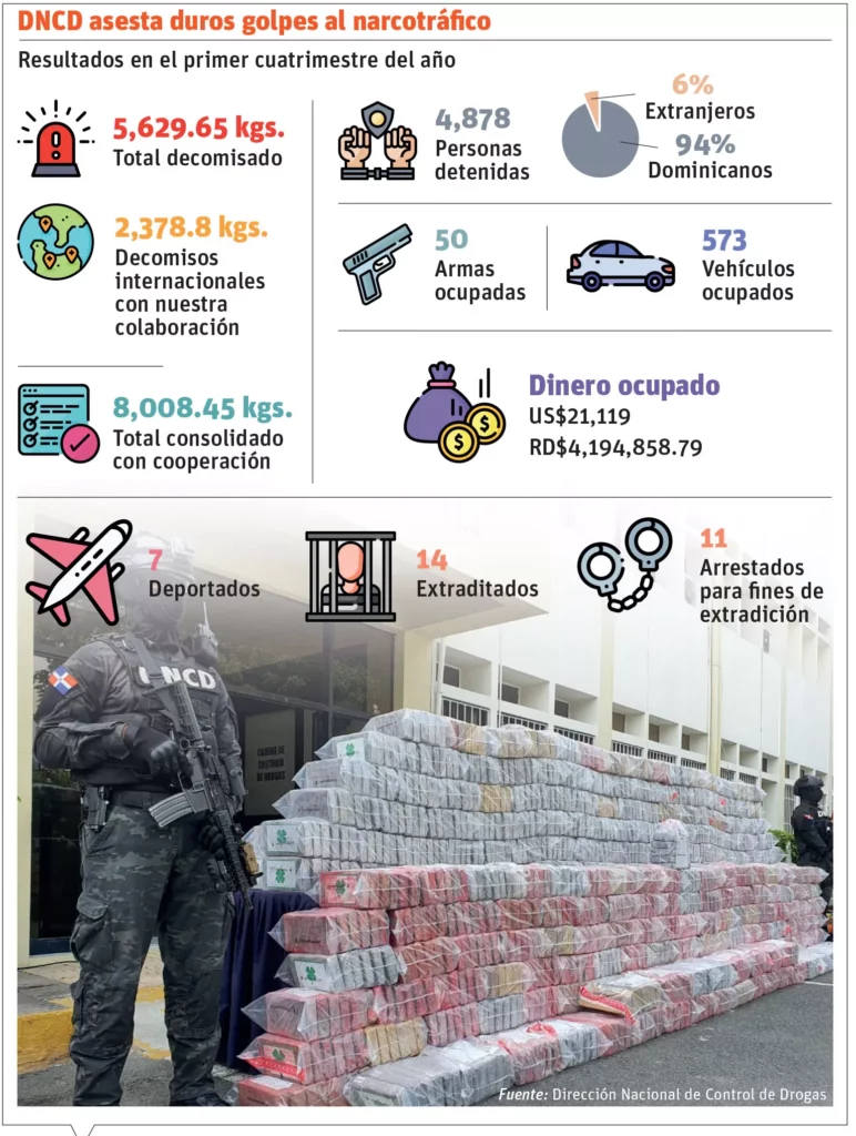 SANTO DOMINGO.-En los últimos ocho meses la Dirección Nacional de Control de Drogas (DNCD) ha propinado duros golpes al narcotráfico con el decomiso de unas 14 toneladas de cocaína al nivel nacional.