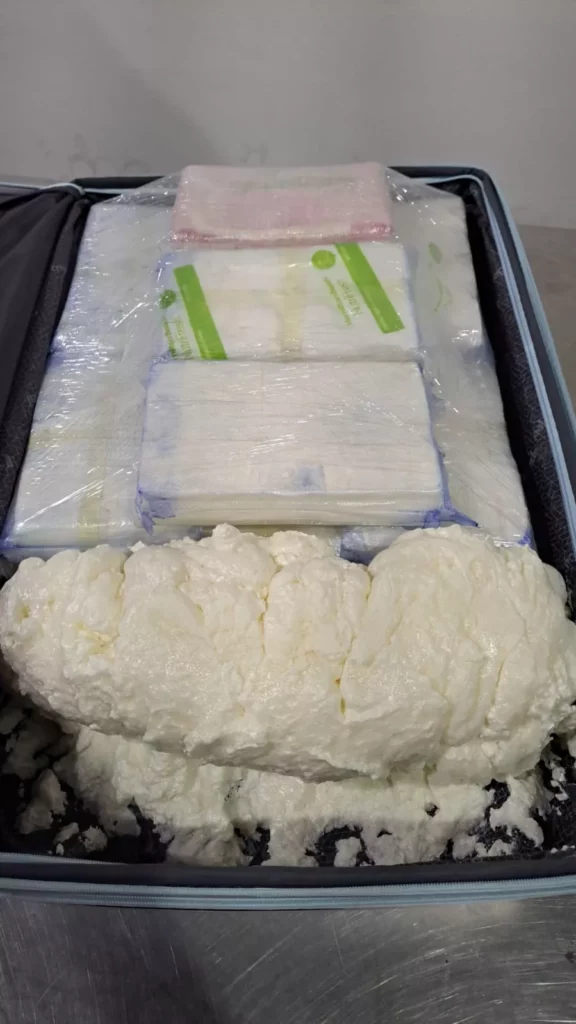 “ La maleta en cuyo interior se hallaron los paquetes, los cuales estaban partidos en dos, tenían en su interior una especie de espuma sellante blanca, esto para impedir que la sustancia pueda ser detectada por las autoridades”
