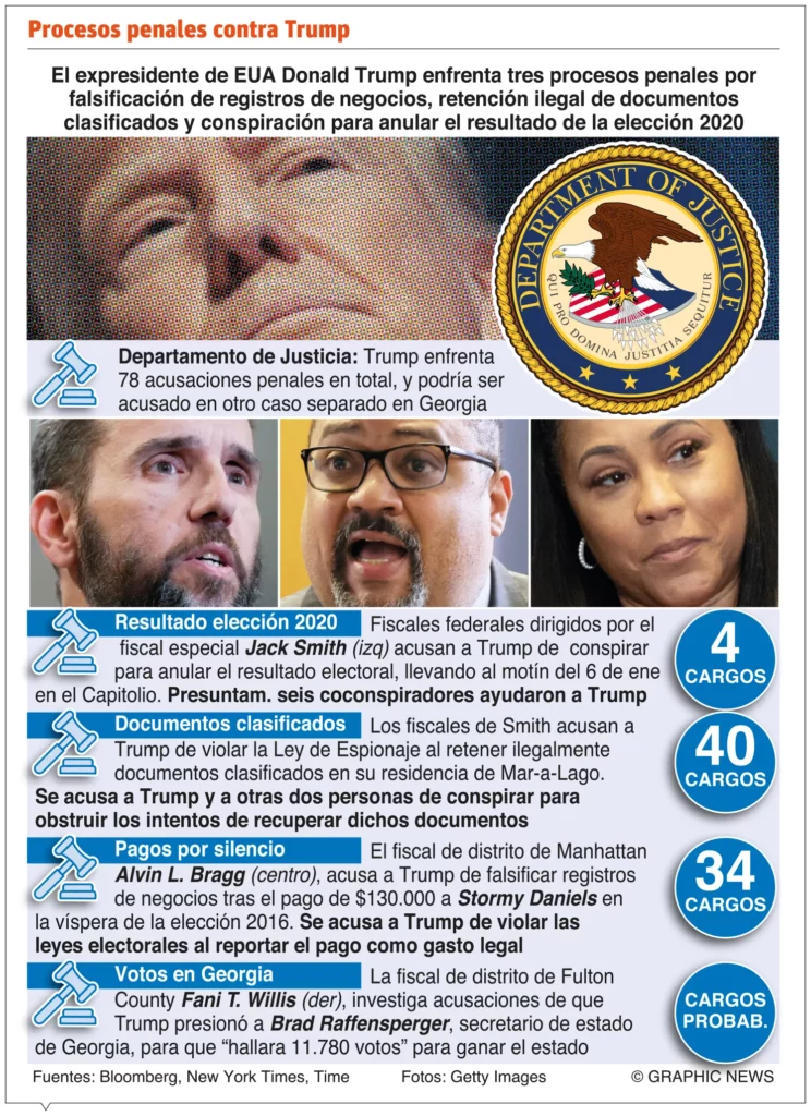 Trump compareció el jueves pasado ante el tribunal federal del Distrito de Columbia, donde se declaró no culpable de los cuatro delitos que se le imputan por supuestamente haber intentado revertir las elecciones de 2020 en las que perdió contra el actual mandatario, Joe Biden, y por haber instigado el asalto al Capitolio.