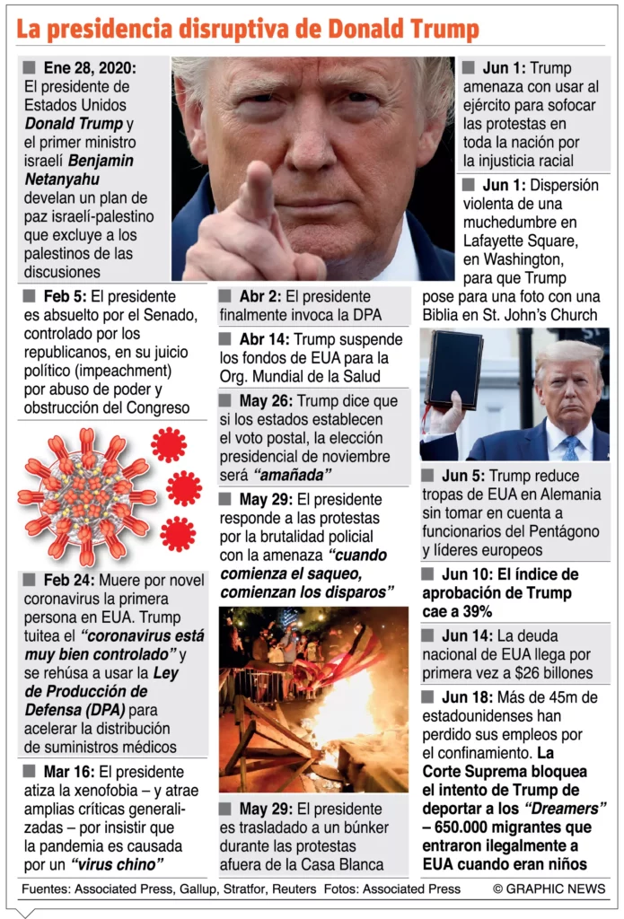 WASHINGTON.-El presidente Donald Trump utilizó su retorno a los mítines para definir los próximos comicios presidenciales como una elección entre patrimonio nacional y radicalismo de izquierda, pero su muestra de fuerza política durante la pandemia no atrajo a los miles que esperaba y se vio eclipsada por nuevos casos de coronavirus entre su personal de campaña.