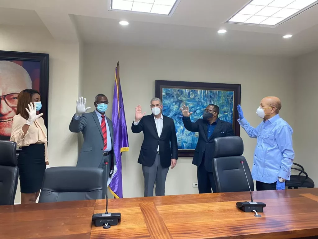 Guardando el debido distanciamiento recomendado por las autoridades sanitarias y protegidos con mascarilla y guantes, Gonzalo Castillo juramentó a los alcaldes y la regidora en la Oficina del Comité Político de la Casa Nacional del PLD, con el acompañamiento del presidente de esta organización, Temístocles Montás.