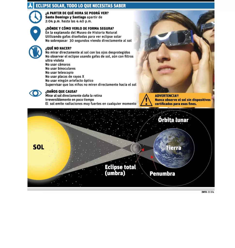 La Sociedad de Astronomía Dominicana y el Ministerio de Salud Pública advierten a la ciudadanía abstenerse de mirar directamente al sol con los ojos desprotegidos, ni intentar observar el eclipse usando gafas de sol que aunque tengan filtros ultra violeta no son suficiente para proteger los ojos de un daño irreversible. Tampoco usar cámaras, binoculares, telescopio, placas de rayos X, ni ningún otro artefacto óptico para observar el fenómeno.