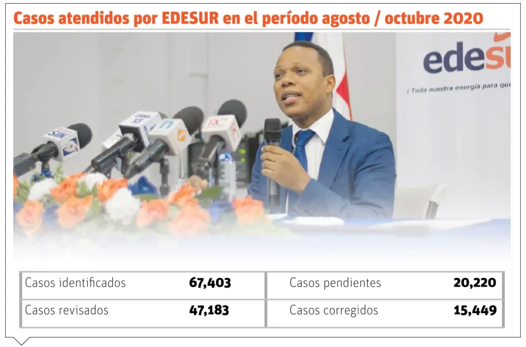 SANTO DOMINGO.-La empresa Edesur Dominicana devolvió entre agosto y octubre de este año alrededor de 60 millones de pesos, correspondientes a unas 15,449 correcciones hechas a facturas de clientes que presentaron reclamaciones por alta facturación y otros identificados.