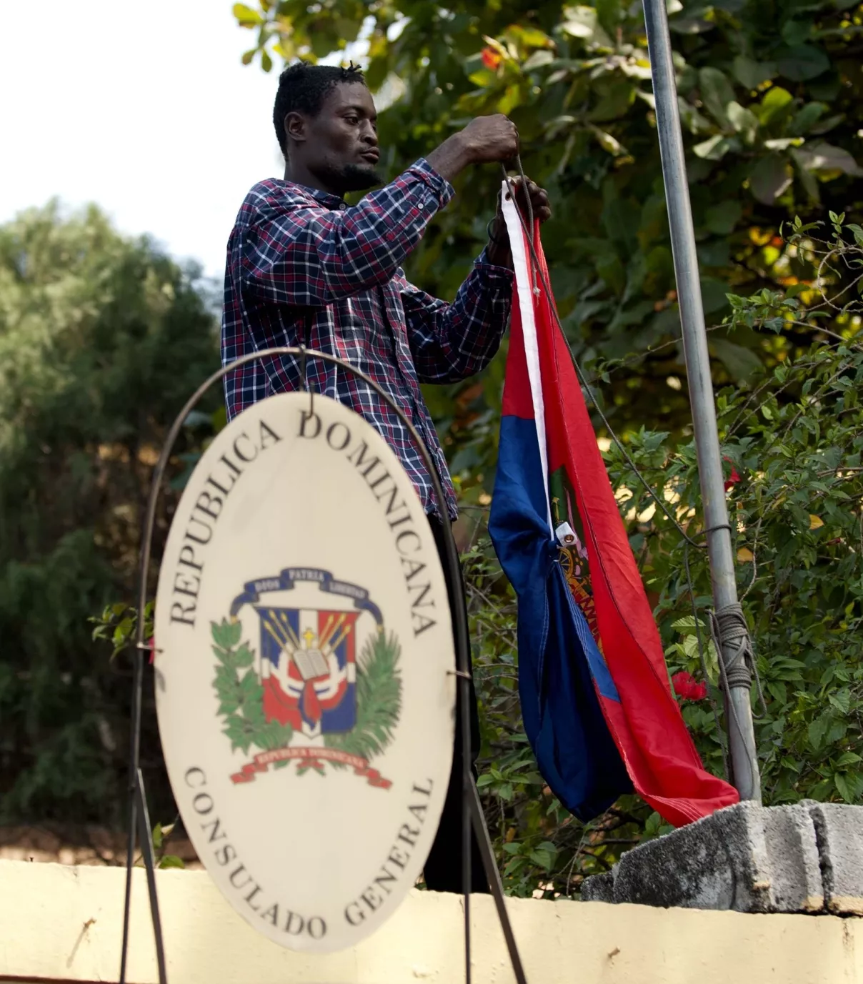 Un manifestante haitiano mientras izaba la handera haitiana en el consulado dominicano.