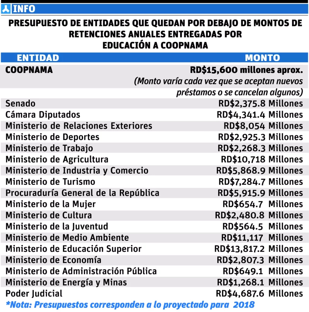 Santo Domingo.-Como parte de las retenciones por préstamos a maestros y personal administrativo, el Ministerio de Educación entrega mensualmente RD$1,300 millones a la Cooperativa Nacional de Maestros (Coopnama), cifra que sobrepasa el presupuesto de 14 ministerios y otras entidades importantes del Estado.