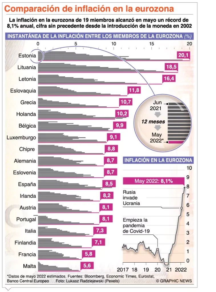 La inflación de estos países ha tenido como detonante la guerra en Ucrania, que ha disparado los precios de los combustibles, las materias primas y la mayoría de los alimentos, reduciendo las perspectivas de crecimiento que tenía el mundo tras ir saliendo de manera paulatina de la pandemia.